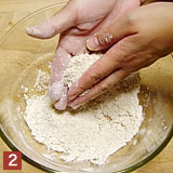 タルト台を作ります。全粒薄力粉、塩、メープルシュガーをよく混ぜてから菜種油を加えて両手でよくすり合わせる。水を加えてフォークなどでさっくりとまとめます。 |