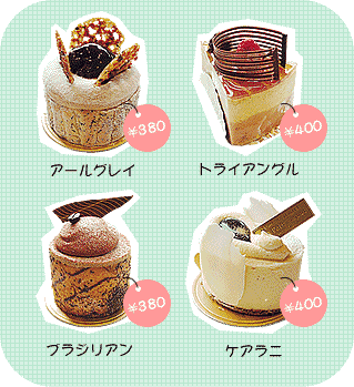 今月のおすすめケーキです。トライアングル、ブラジリアン、ケアラニ、アールグレイの4点を紹介します。どれもデリケートですが、味も風味もしっかりとしています。シェフの感性が光ります。
